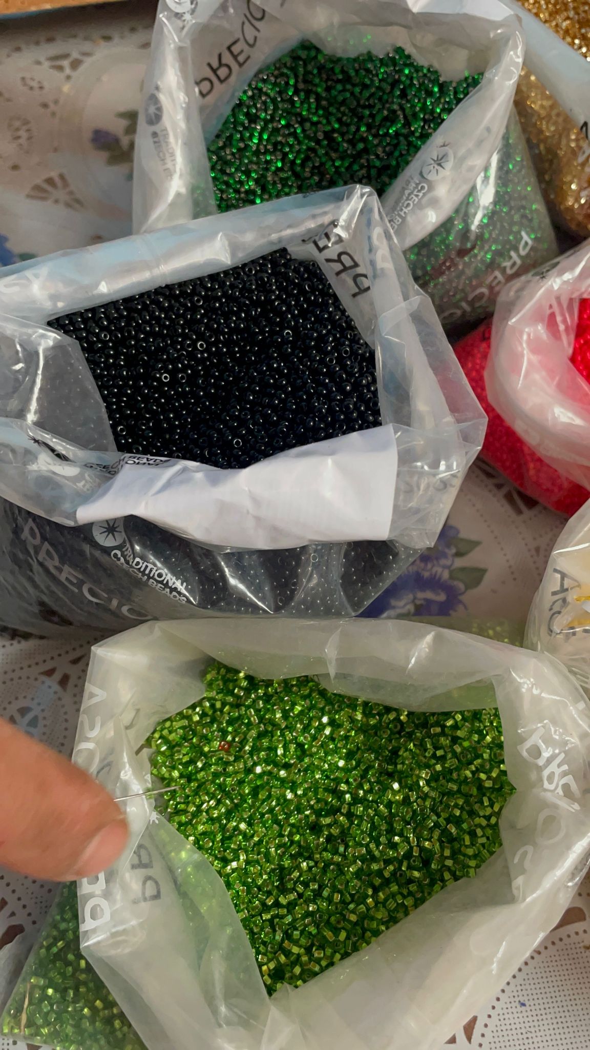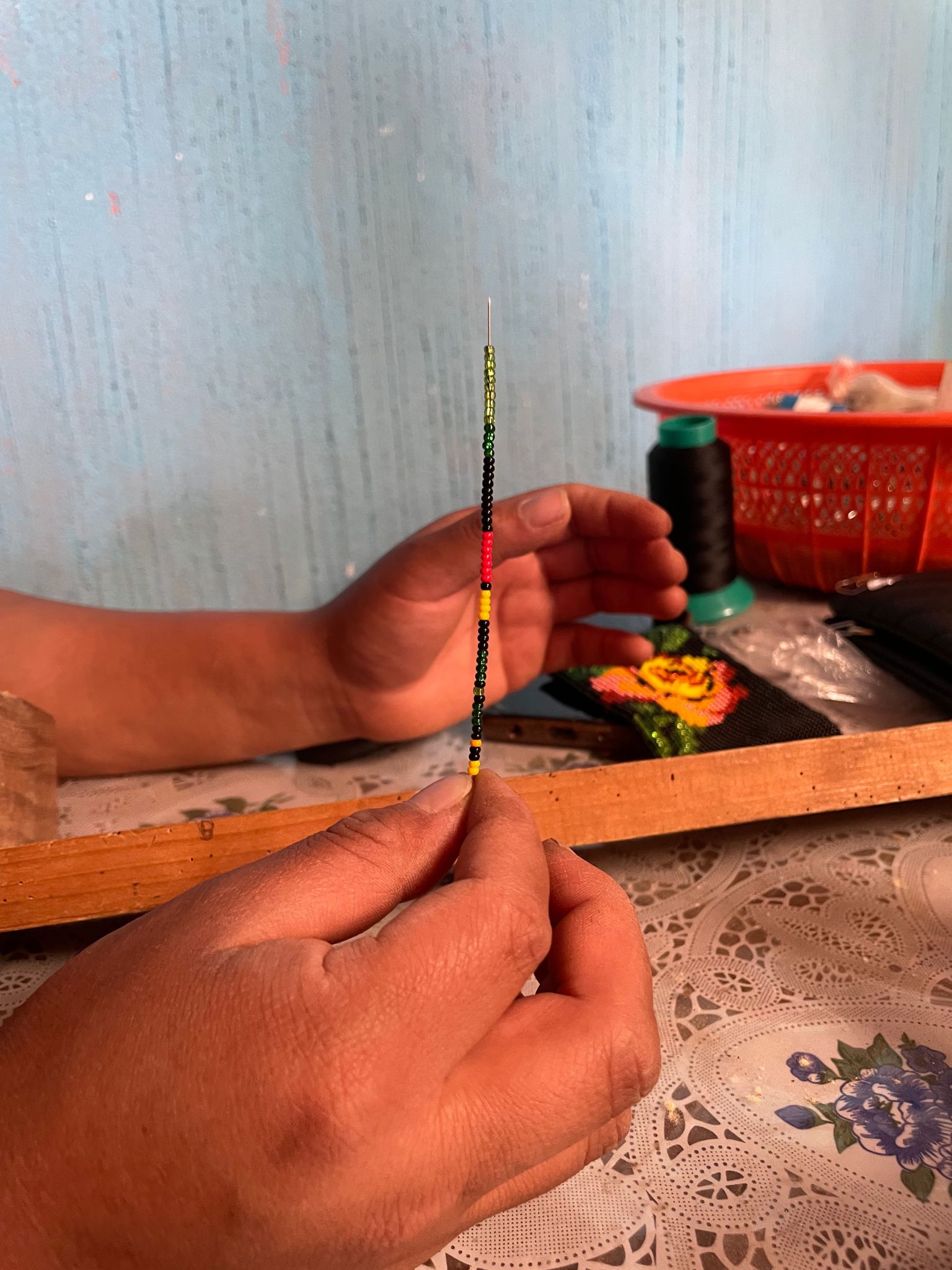 The ProcessIn Martha's workspace, artistry emerges with quiet intensity. Bags of colorful glass beads surround her traditional loom, its wooden slider and combs precisely positioned. She threads a needle with fluid movements, collecting beads in an intricate, memorized pattern—no template guiding her hands.